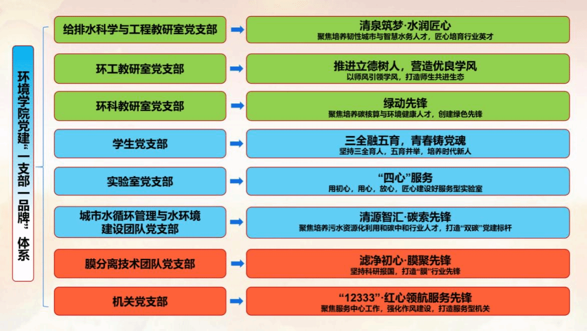 坚守一个核心使命,推动基层党组织全面进步全面过硬。强化制度落实。落实党支部“三会一课”、谈心谈话、主题党日等制度并开展专项检查整改,每半年查阅一次支部会议记录。建立党支部书记工作例会制度,完善党委委员联系党支部制度,加强对支部工作指导。制定党支部书记抓党建述职评议考核办法,“领导点评+党员测评”相结合,突出结果运用,强化激励效应。绘制党员发展流程图,严格标准程序,提高党员发展质量。打造特色品牌。以“党建红”引领“生态绿”,凝练富有环境特色的党建品牌,制定“一支部一品牌”创建方案,培育更多“样板支部”和“双带头人工作室”。比如,给排水科学与工程教研室聚焦为韧性城市建设培养智慧水务人才,提出“清泉筑梦·水润匠心”建设品牌;膜分离技术团队党支部聚焦研发新一代膜技术,提出了“滤净初心·膜聚先锋”建设品牌,等等。建强头雁队伍。严格规范程序,完成6个教工党支部换届,10余名热心党建、业务水平高、群众基础好的年轻党员教师进入支部班子,“双带头人”队伍更加壮大。创新活动载体。推动党建“走出去”,与同济大学等一流大学哔咔漫画 、北控水务集团等行业龙头企业、学校党办校办党支部等开展联合共建。丰富支部活动,持续开展“永远跟党走、奋进新征程”“党建引领聚合力、学风建设促发展”等主题活动60余次。发挥“两个作用”。在转型升级、招生就业、稳定安全等重点工作中,党支部聚人心、强保障,党员走在前、作表率,基层党组织政治功能、组织功能不断增强。强化工作保障。近三年共投入党建经费30余万元,用于党建“双创”、党建活动室升级改造、活动开展等。
