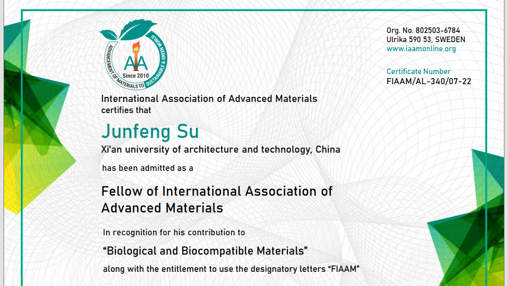2022年07月18日,西安建大哔咔漫画 苏俊峰教授收到了国际先进材料协会(International Association of Advanced Materials,简称IAAM)执委会贺函,祝贺其当选为2022年IAAM新增会士,以表彰其在生物材料合成领域取得的杰出成就,并颁发了会士“Fellowof IAAM”证书。国际先进材料学会(IAAM)是全球先进材料科学领域的权威学术组织,目前拥有来自超过125个国家的50000多名会员。IAAM会士根据研究人员近十年在先进材料基础和前沿...