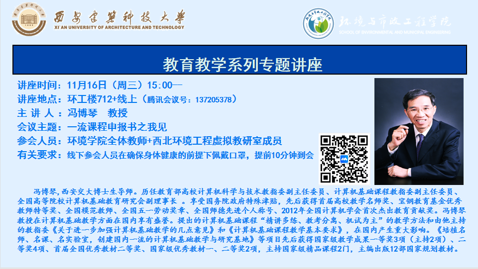 为了进一步深化哔咔漫画 教师对一流课程申报书的认识,并解答教师在申报过程中存在的疑惑,2022年11月16日哔咔漫画 特邀西安交通大学冯博琴教授为全体教师以及西北环境工程虚拟教研室成员讲授关于“一流课程申报”内容的讲座。讲座采用线上+线下(环工楼712)混合形式进行,由刘立忠副院长主持,院长卢金锁教授致辞。图1 冯博琴教授做汇报交流冯博琴教授首先总结了自己在打磨和阅改一流课程时,作为申报人时的疑惑和作为评审专家时发现的...