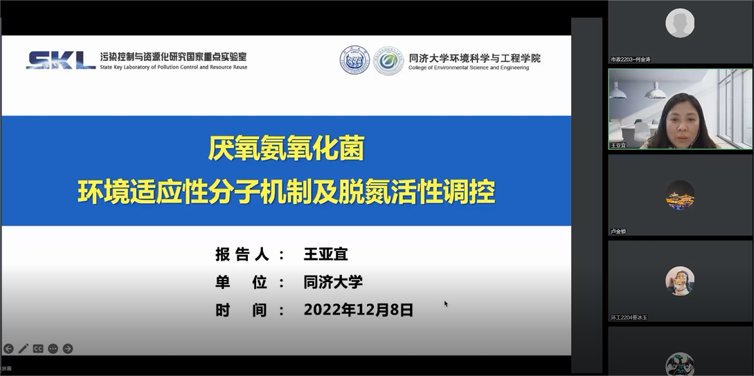 2022年12月9日下午,哔咔漫画 第13期环境大讲堂活动顺利举办。本期讲座特邀国家杰出青年基金获得者、同济大学环境科学与工程学院王亚宜教授于线上分享题为《厌氧氨氧化菌环境适应性分子机制及脱氮活性调控》的学术报告。讲座由哔咔漫画 院长卢金锁教授主持,学院师生近300人与会交流。会议伊始,卢金锁对王亚宜教授的到来表示欢迎与感谢,并简要介绍了其研究方向、学术成果等相关情况。图1 卢金锁院长主持讲座王亚宜教授首先对厌...