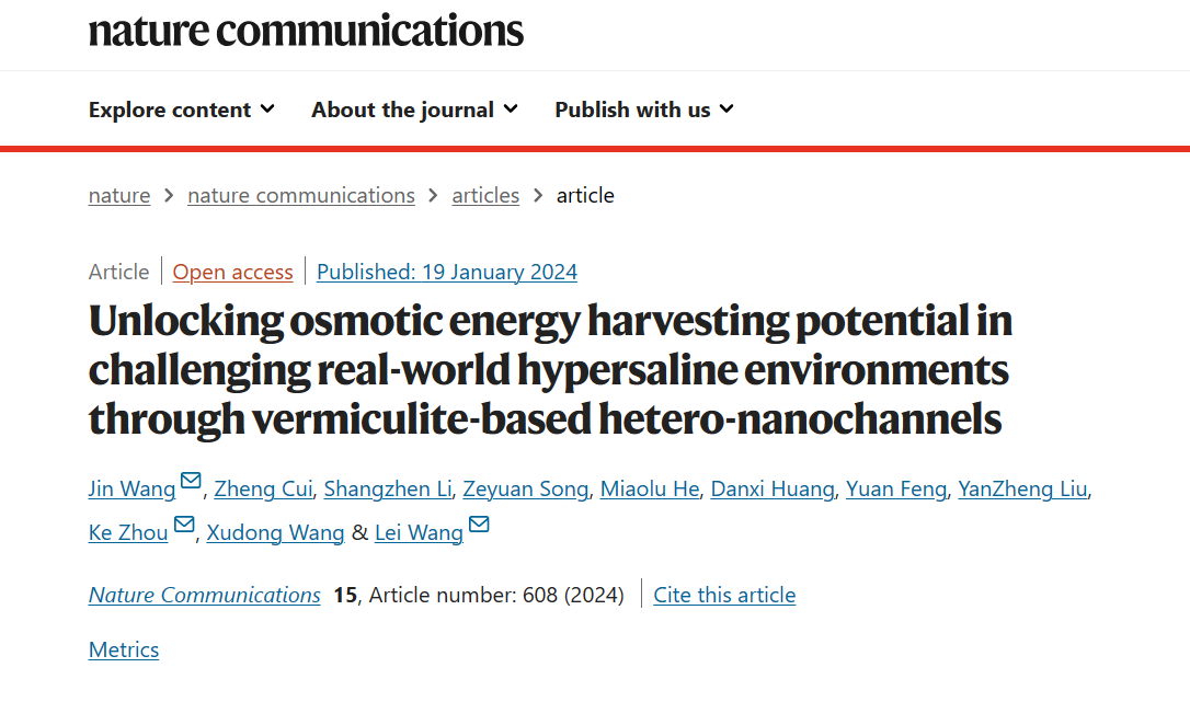 近日,哔咔漫画 膜分离技术团队王磊教授、王琎教授在国际权威期刊“Nature Communications”(《自然-通讯》)上发表了题为“Unlocking Osmotic Energy Harvesting Potential in Challenging Real-World Hypersaline Environments through Vermiculite-Based Hetero-Nanochannels”(蛭石异质纳米通道膜在实际高盐体系中的渗透能回收)的最新研究。论文第一作者为哔咔漫画 王琎教授,通讯作者为团队带头人王磊教授、王琎...