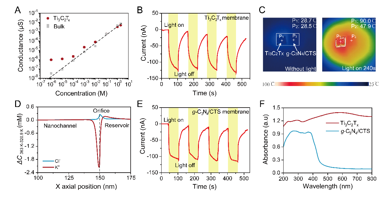 作者首先分别对Ti3C2Tx与g-C3N4/CTS均质二维层状膜内的离子传输情况进行了实验,结果表明离子在两种层状膜内纳米通道中的输运过程均受到通道表面电荷的重要影响,特别是在电解质浓度较低时,纳米通道表面电荷的静电作用更强,Ti3C2Tx和g-C3N4/CTS的跨膜离子电导也与溶液浓度呈现出非线性关系。在光驱动离子传输方面,两种均质膜内的离子传输均受到了外界光照的影响。当光照射Ti3C2Tx薄膜单侧60s,光电流值增加到-130nA。利用热红外相机对Ti3C2Tx膜表面温度的实时观测发现,随着照射时间的增加,Ti3C2Tx膜表面温度出现快速升高,可以推测由于纳米通道内温度梯度的出现,离子出现了主动传输的现象。将液池内分别加入具有不同温度的溶液时,也观察到了与温差方向相反的明显的电流值,从实验角度证明不对称温度条件对离子传输的影响,且离子倾向于从低温区域流向高温区域定向移动。从热力学角度,由于光照区域附近溶液的吉布斯自由能由于温度的升高而减小,离子将自发的向吉布斯自由能递减的方向扩散,基于连续泊松-能斯特-普朗克理论和爱因斯坦-斯托克斯理论数值模拟证明,这一从低温侧向高温侧的定向传输导致在纳米通道的出口处出现了K+的明显消耗和Cl-的轻微积累。在g-C3N4/CTS膜的光响应特性研究中发现,在光照条件下也出现了明显的离子电流。然而在光照下,通过实时监测膜表面温度,发现g-C3N4/CTS膜表面温度并无明显变化,因此排除了光热效应的可能性。基于UV-可见漫反射光谱和Mott-Schottky测算可以看到,由于g-C3N4的半导体特性,在光照下电子与空穴将发生分离,电子向未光照部分的扩散将导致g-C3N4/CTS膜上的电荷分布不对称,从而也激发了光驱动离子迁移现象。