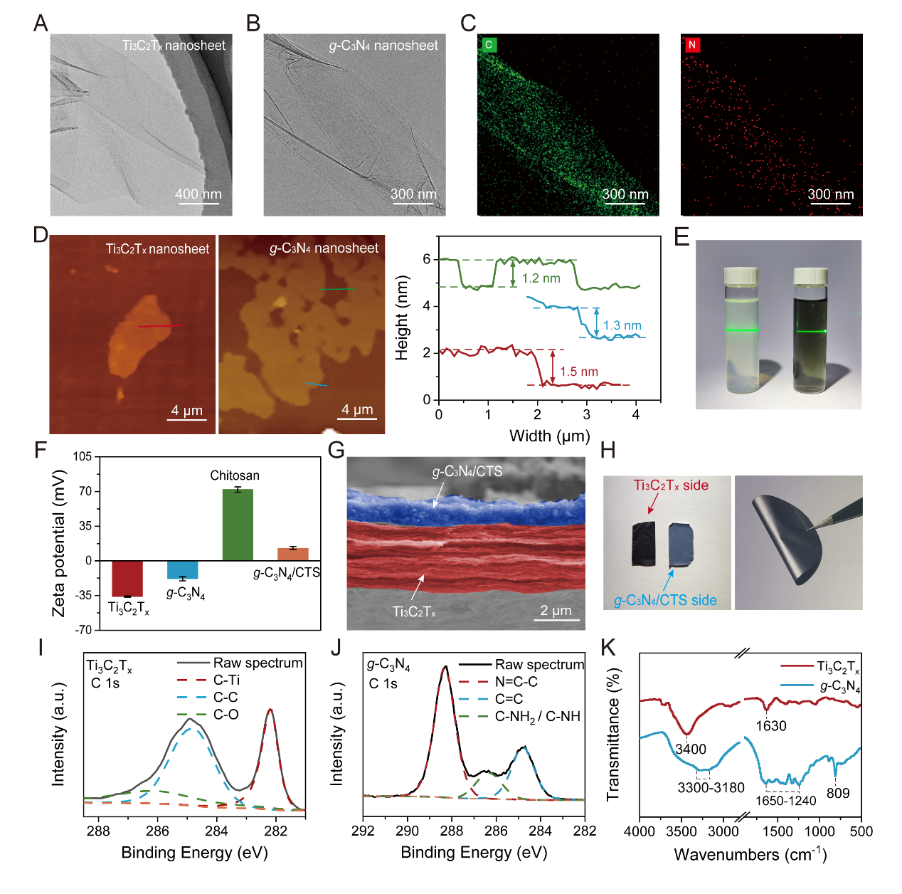 图1.光响应异质性二维Ti3C2Tx-g-C3N4/CTS(TCC)纳米通道膜的制备流程示意图
