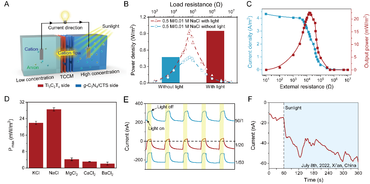 生物细胞膜中的高效离子传输功能为提升盐差能的回收效率提供了新的灵感。特别是生物离子通道在包括pH、温度和光等外界刺激的智能响应性离子传输,引起了研究者的广泛兴趣。其中,阳光由于其自然存在范围广,以及在照射位置、强度及方向上的独特灵活性,被认为是一种重要离子传输驱动力,以用于离子传输过程的精准调控。尽管目前研究者已经初步证明了利用光照对离子传输行为的调控的可能性,然而,实现与在自然阳光下生物通道内快速、高效的选择性离子传输,进而强化盐差能转化效率仍是一项极具挑战性的任务。