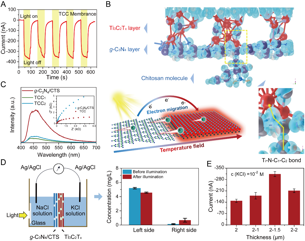 为了最大限度的促进光对离子定向传输的调控,作者尝试将Ti3C2Tx固有的光热转换特性与g-C3N4/CTS特殊的半导体特性进行耦合。当光照TCC异质膜的g-C3N4/CTS侧时,得到了-370 nA的光电流,高于均质Ti3C2Tx膜和g-C3N4/CTS膜各自产生光电流的大小之和(约-240 nA)。基于密度泛函的理论计算表明,当与g-C3N4/CTS形成异质结时,Ti3C2Tx将起到桥联作用促进光生电子的转移,此外,壳聚糖分子的引入进一步加速电子在界面的迁移,由此产生的不对称电荷极性引发了从g-C3N4/CTS侧到Ti3C2Tx侧的定向离子电流。同时,由于g-C3N4/CTS膜具有良好的透光率,g-C3N4/CTS侧的光照也使Ti3C2Tx膜的温度升高。从g-C3N4/CTS侧到Ti3C2Tx侧出现的热场进一步增强了离子传输驱动力,光热和光电协同效应引发了更为明显的光诱导离子电流。当两侧液池中分别加入NaCl与KCl溶液中时,在光照180 s后,g-C3N4/CTS侧液池中的Na+浓度下降,而另一液池中的Na+浓度相应增加,并且两侧液池中的K+浓度在光照前后几乎保持不变,表明阳离子在光驱动下会选择性的从g-C3N4/CTS侧运输到Ti3C2Tx侧。为了优化TCC异质膜的耦合光控离子传输效应,将Ti3C2Tx膜厚度固定在2 μm,使g-C3N4/CTS膜厚度从1 μm增加到1.5 μm,发现离子电流从-180 nA明显增加到-313 nA,这是因为g-C3N4/CTS负载的增加促进了Ti3C2Tx-g-C3N4/CTS光电效应,然而,随着g-C3N4/CTS负载量的不断增加,不仅增加了离子传输阻力,而且降低了g-C3N4/CTS膜的透光性,导致光电流降低。