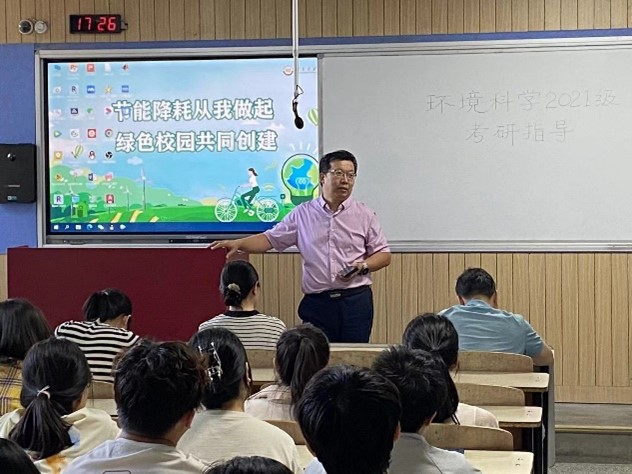 首先冯永宁首先强调了考研决策的重要性。他告诫学子们不要盲目跟风,要根据自身实际情况深思熟虑后再做决定。同时鼓励大家坚持到底,踏实前进,他指出学工办一如既往的会支持学生考研升学,将与环科教研室老师紧密对接,为学子们提供坚实的后盾。